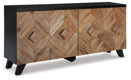 Signature Design by Ashley®Storage options abound with this accent cabinet featuring 4 chevron pattern doors accented by long dark gray finished metal door pulls. Store dinne...