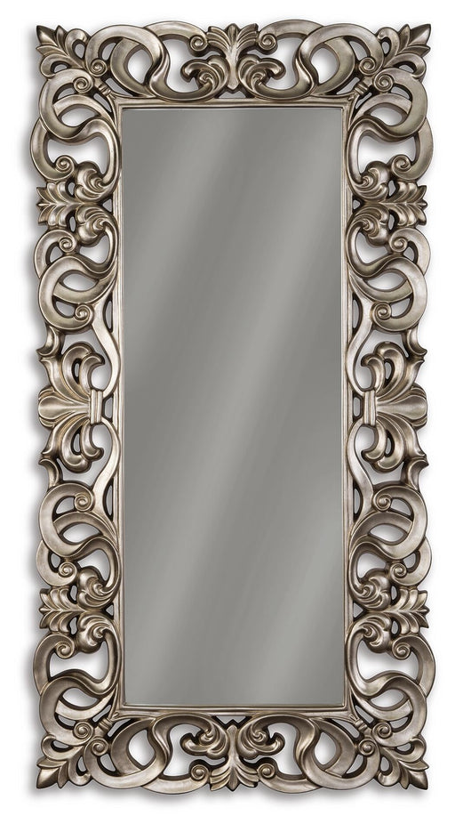 Signature Design by Ashley®Exquisitely crafted for any glamour queen, this floor mirror is a splendid accent. Antique silver finish brings life to the ornate scroll design.Sp...