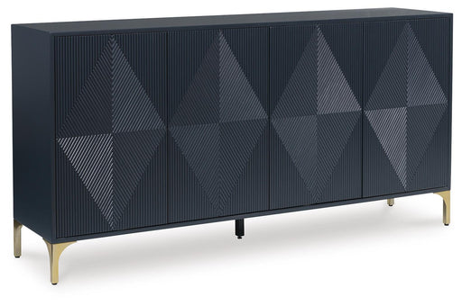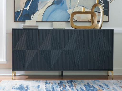 Signature Design by Ashley®Elevate your aesthetic with the chic design of this accent cabinet. Sleek goldtone legs and striking doors with a geometric pattern infuse contempo...