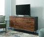 | Details | Made with sheesham wood, mango wood, veneer and engineered wood, Natural and deep brown finish, Hardware with black finish, 3 doors with soft-close hinges, 2 fixed shelves, Openings in back for electronics, Minor assembly required, simply lay flat and attach feet | |