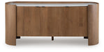 This stunning accent cabinet combines modern design with sophisticated materials. Its natural finish and sleek white marble top create an elegant contrast, while the unique rounded silhouette adds a touch of contemporary flair. Three doors open to reveal shelves and storage space, making this piece as practical as it is beautiful.