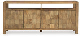 | Details | Made with mango wood solids, engineered wood and veneer, Natural brown finish, Door fronts with high-low block pattern, 4 doors with magnetic push latch function, 2 adjustable shelves | |