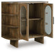 This accent cabinet puts a uniquely chic spin on a classic storage solution. It seamlessly blends clean lines with mid-century inspired curves, donning a light brown finish for that much more versatility. Exposed side shelves eagerly welcome your favorite decorative pieces, while additional shelves behind the glass-paneled doors offer ample storage.