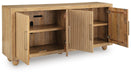 This accent cabinet offers abundant storage with casually cool style and versatility. Its four doors, accented with fluting and goldtone metal pulls, conceal two fixed shelves perfect for dinnerware, cookbooks or anything you want to tuck away. The natural and cream antiqued finish over solid mango wood complements a wide range of decor, making it an easy addition to your living or dining area.