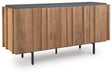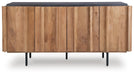 | Details | Doors, sides and interior made with solid mango wood, Back made with mango veneer and engineered wood substrate, Light brown finish, Engineered wood top with charcoal gray finish, Metal legs with black finish, 4 doors, 3 fixed shelves, Openings in back for electronics, Minor assembly required, simply lay flat and attach feet | |