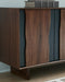 Details Made with acacia wood, acacia veneer and engineered wood, Medium brown and charcoal gray finishes, Hidden door pulls, Live edge door fronts, 2 doors with soft-close hinges, 1 sliding door, 2 fixed shelves, Openings in back for electronics, Due to the use of natural materials, some variations may occur, Minor assembly required; simply lay flat and attach feet