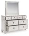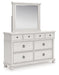 | Details | PCB823B5: Includes headboard/footboard panels, posts and poster rails , Made with hardwood solids, veneers and MDF substrates , Side rails feature laminated solid hardwood slat support rails (or LVL) with glued and screwed blocking for added strength, Rubbed antiqued white finish , Foundation/box spring required, sold separately, Mattress available, sold separately , Assembly required, PCB823B1: Includes dresser and mirror, Dresser made with hardwood solids, veneers and MDF substrates , Mirror made with solid wood, Rubbed antiqued white finish, Metal hardware with pewter-tone finish, 8 smooth-gliding drawers with fully finished interiors, French/English dovetail construction and heavy-duty ball-bearing side glides, Top drawers felt lined, Mirror attaches to back of dresser, | |