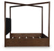 Casual contemporary styling with a decidedly modern vibe. Bathed in a rich dark brown finish, this California king canopy bed is warm and inviting. Its integrated “X” canopy and full wrap-around rails set to the floor adorn your restful retreat with on-trend elegance. Dual USB charging on both sides of the upholstered headboard is a subtly cool way to keep your electronics at the ready. What a simply stunning way to achieve the bedroom of your dreams.