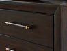 Details Made with hardwood solids, mango wood veneer and MDF substrates, Merlot finish, Solid wood pulls with brass-tone metal accents, 6 smooth-gliding drawers with fully finished interiors, French/English dovetail construction and heavy-duty ball-bearing side glides, Top drawers felt lined, Round tapered legs