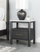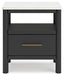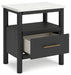 Details Made with engineered wood (MDF/particleboard/plywood) and decorative laminate for the right balance of affordability and durability, Matte black finish with subtle replicated wood grain, Replicated white marble top, Decorative laminate replicates natural or man-made material surfaces with consistent color, pattern and texture, Handles with light bronze-tone finish, 1 smooth-gliding drawer, Drawer interior is lined with a faux linen laminate for a clean, finished look, Open shelf, USB and Qi wireless charging options, Ambient lighting under the top, Power cord included; UL Listed, Minor assembly required