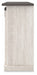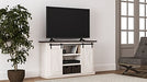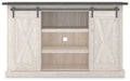| Details | Made of engineered wood and decorative laminate, Antique white finish, Top with replicated gray wood grain, Metal brackets and hardware, Pair of sliding barn doors, 2 adjustable center shelves; 4 side shelves, Cross-buck details, Cutouts for wire management, Assembly required | |