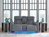 Details One-touch power control with adjustable positions, Easy View™ adjustable headrest and zero-draw USB port, Zero-draw technology only consumes power when the USB receptacle is in use, Extended ottoman for enhanced comfort, Corner-blocked frame with metal reinforced seat, Attached cushions, High-quality foam cushions wrapped in poly fiber, Next-Gen Nuvella is a performance fabric that is soft, easy to clean, stain-resistant and durable, Clean fabric with mild soap and water, let air dry; for stubborn stains, use a solution of 4 oz. bleach to 28 oz. water, Ambient blue LED lighting on base and storage cutouts for a theater-style experience, Storage armrests with 2 cup holders; center console with 2 cup holders and hidden storage, Power cord included; UL Listed