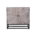 Eye-catching, the dramatic wood starburst pattern on the door fronts are masterfully cut and hand-placed to create an organic and textured look. This piece is balanced out with a grey surround and metal base.