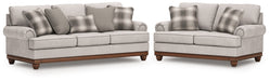 Details PC5680338: Corner-blocked frame, Attached back and reversible seat cushions, High-resiliency foam cushions wrapped in poly fiber, Accent pillows included, Pillows with soft polyfill, Polyester upholstery, Decorative turned legs with faux wood finish, Platform foundation system resists sagging 3x better than spring system after 20,000 testing cycles by providing more even support, Smooth platform foundation maintains tight, wrinkle-free look without dips or sags that can occur over time with sinuous spring foundations, PC5680335: Corner-blocked frame, Attached back and reversible seat cushions, High-resiliency foam cushions wrapped in poly fiber, Accent pillows included, Pillows with soft polyfill, Polyester upholstery, Decorative turned legs with faux wood finish, Platform foundation system resists sagging 3x better than spring system after 20,000 testing cycles by providing more even support, Smooth platform foundation maintains tight, wrinkle-free look without dips or sags that can occur over time with sinuous spring foundations,