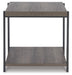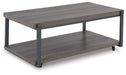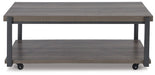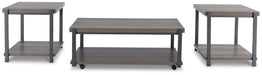 Details Includes coffee table and 2 end tables, Made with MDF substrate, decorative paper laminate and metal, Laminate features a replicated wood grain with a weathered gray coloration, Metal frame with gunmetal powder coat finish, Open storage shelf, Coffee table with casters for easy mobility, Assembly required