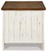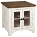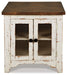 Double take. Sporting a two-tone finish that pairs a distressed vintage white with aged natural pine color, this end table elevates the art of rustic farmhouse living. Enhancing its charm: shelved storage visible through cabinet doors with inset metal grills.