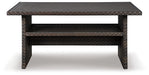 Details All-weather resin wicker handwoven over rust-free aluminum frame, Powder coated aluminum resists rusting and fading, Aluminum tabletop, Versatile outdoor coffee-dining table, great for game night or entertaining, Lower shelf, Assembly required