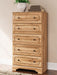 Country rustic. Vintage inspired. However you see it, you’re sure to be charmed by this chest of drawers. Adorned with chic drawer knobs and a warm oak grain finish, it offers a relaxed mix of picturesque aesthetics. Its storage space gracefully welcomes clothes, linens and other bedroom necessities. With an air of easygoing elegance, this dresser lets you drift away to a simpler time and place.