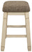 The beauty of this upholstered bar stool is something to savor. Designed to serve up comfort and flair, this backless bar stool entices with a saddle seat covered in a heavy woven fabric that complements the antiqued white finish.