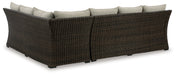 | Details | Includes sofa sectional and bench, All-weather resin wicker handwoven over rust-free aluminum frame with durable powder coated finish, Solution-dyed high-performance fabric, Nuvella+™ is an outdoor fabric that can be cleaned and offers enhanced UV resistance, Clean fabric with mild soap and water, let air dry; for stubborn stains, use a solution of 4 oz. bleach to 28 oz. water, Stainless steel hardware, Designed to withstand the harsh elements of the outdoors, Throw pillows included, Assembly required | |