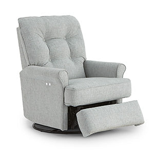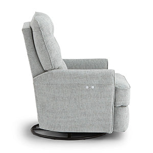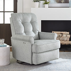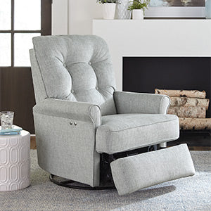 The Carissa recliner makes decorating a breeze with a transitional look that works in any room of your home. Enjoy long-lasting comfort and support with a luxurious pillow-fiber-filled back and solid foam seat…scaled to fit almost any space but engineered to stretch out. Choose from more than 700 fabric options to make it your own. It also includes a smooth swivel glider action for the ultimate in relaxation. Recline to any position at the touch of a button with the Power option or opt for a discreet inside-handle manual recline…and enjoy!