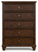 | Details | Made with hardwood solids, birch veneer and MDF substrate, Brownish cherry finish, 5 smooth-gliding drawers with dovetail construction and ball-bearing side glides, Round metal drawer knobs with satin nickel-tone finish, Tapered feet, Framed drawer fronts | |