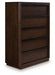 Casual contemporary styling with a decidedly modern vibe. This chest of drawers is warm and inviting with a rich dark brown finish, adorning your restful retreat with on-trend elegance. Full-length metal pulls in a matte black finish add a subtly cool touch to spacious storage drawers. What a simply stunning way to achieve the bedroom of your dreams.