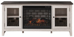 | Details | Includes TV and electric fireplace insert (W100-101), Made of decorative laminate and engineered wood, Two-tone finish (replicated gray wood top and antique white base), Pair of glass inset doors, Adjustable center shelf; 2 side shelves, Cutouts for wire management, Electric fireplace insert provides up to 5,386 BTU/1,500W and warms up to 1,000 square feet (heats larger rooms), 7-level temperature setting; 5 levels of flame brightness, LED-lit multi flame display operates with or without infrared heat; realistic-looking log set with dynamic glowing embers, Remote control with LED display, Timer function with programmable ranges from 10 minutes to 9 hours; overheating control device, Power cord included; UL Listed, Assembly required; simply remove the center shelf and back panel to make room for the fireplace insert | |