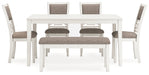 | Details | Includes dining table, 4 chairs and bench, Table made with rubberwood solids, mindi veneer and MDF substrates, Chair and bench made with solid wood frame and engineered wood, White finish, Light gray textured polyester upholstery, Foam seat and back cushions, Chair with adjustable levelers; backrest with fretwork accent, Tapered legs, Seats up to 6, Assembly required | |