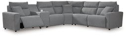 | Details | Includes 6 modular pieces: left-arm facing power recliner, 2 armless chairs, console, wedge and right-arm facing power recliner, "Left-arm" and "right-arm" describe the position of the arm when you face the piece, Versatile modular pieces fit together in a variety of configurations, One-touch power control with adjustable positions, Easy View™ adjustable headrest and zero-draw USB port, Zero-draw technology only consumes power when the USB receptacle is in use, Corner-blocked frame with metal reinforced seat, Attached back and seat cushions; high-quality foam cushions wrapped in poly fiber, Polyester upholstery; Next-Gen Nuvella™ is a family-friendly fabric that is soft, easy to clean, stain-resistant and durable, Clean fabric with mild soap and water, let air dry; for stubborn stains, use a solution of 4 oz. bleach to 28 oz. water, Throw pillows with easy-to-remove zippered covers for machine washing; pillows with soft polyfill, Console with plexiglass top and 2 cup holders, Zero wall recliner design requires minimal space between wall and chair back, Power cord included; UL Listed | |