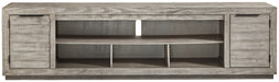 Balancing chic flair with a relaxed sensibility, this extra-large TV stand strikes just the right tone for rustic sophistication. Beautifully clean lines are subtly enhanced with relaxed distressing and saw marks for authentic barn wood character. You're sure to love the convenient open style for easy access to media equipment and accommodating pretty home accents.