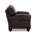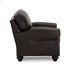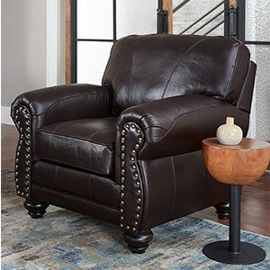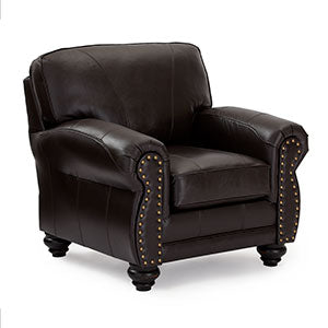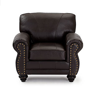 This masculine club chair blends rustic charm with sophisticated class. The antique nail heads outline the front of the Noble's arms, drawing attention to the soft curves and warm nature of this piece. The carefully carved feet support this solid club chair while lending a subtle refinement with the Dark Walnut, Espresso or a Riverloom wood. Comfort is not sacrificed by style as the cushion features encased coil springs giving a resilient, yet plush feel. Make it yours by choosing from an assortment of top-grain leather choices.