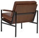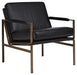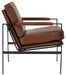 This accent chair has an ultra-modern vibe and indulgent feel. Its metal frame is a chic complement to brown leather seating. With its bronze-tone finish and urban industrial style, this accent chair impresses with high-end looks priced to entice.