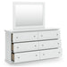 Details B139B43: Includes panel headboard/footboard and rails, Made with engineered wood (MDF/particleboard/plywood) and decorative laminate for the right balance of affordability and durability, Replicated solid white paint, Decorative laminate replicates natural or man-made material surfaces with consistent color, pattern and texture, Foundation/box spring required, sold separately, Mattress available, sold separately, Assembly required, B139B40: Includes dresser and mirror, Made of engineered wood (MDF/particleboard), Knobs with pewter-tone finish, Scalloped moulding, 6 smooth-operating drawers, Includes tipover restraint device, Mirror attaches to back of dresser; can also be mounted on wall horizontally or vertically, Safety is a top priority, clothing storage units are designed to meet the most current standard for stability, ASTM F 2057 (ASTM International), Drawers extend out to accommodate maximum access to drawer interior while maintaining safety,