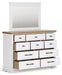 | Details | B844B2: Includes panel headboard, storage footboard, rails and roll slats, Footboard made with hardwood solids, MDF substrates and butcher block oak veneer, Headboard and rails made with hardwood solids and MDF substrates, White finish, Headboard with inset black metal barn sash, 2 drawers in footboard with fully finished interior, dovetail construction and ball-bearing side glides, Pulls with matte black finish, Bed does not require a foundation/box spring, Mattress available, sold separately, Assembly required, B844B1: Includes dresser and mirror, Made with hardwood solids, MDF substrates and butcher block oak veneer, Dresser with 2-tone finish (white finish; butcher block oak veneer with natural finish), Pulls with matte black finish, 10 spacious drawers with fully finished interiors (top drawers felt lined), dovetail construction and ball-bearing side glides , Drawers with inset picture fronts, Mirror attaches to back of dresser, B844-46: Made with hardwood solids, MDF substrates and butcher block oak veneer, 2-tone finish (white finish; butcher block oak veneer with natural finish), Pulls with matte black finish, 5 spacious drawers with fully finished interiors (top drawers felt lined), dovetail construction and ball-bearing side glides, Drawers with inset picture frame fronts, B844-93: Made with hardwood solids, MDF substrates and butcher block oak veneer, 2-tone finish (white finish; butcher block oak veneer with natural finish), Pulls with matte black finish, 3 spacious drawers with fully finished interiors (top drawers felt lined), dovetail construction and ball-bearing side glides, 110V power supply with dual USB charging ports, Power cord included; UL Listed, Drawers with inset picture frame fronts, | |