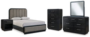 Details B821B2: Includes upholstered panel headboard, footboard and rails , Made with hardwood solids and ash veneer, Black finish on textured wood grain surface , Waterfall edges, Polyester upholstery, Foundation/box spring required, sold separately, Mattress available, sold separately, Assembly required, B821B1: Includes dresser and mirror, Made with hardwood solids and ash veneer, Black finish on textured wood grain surface , Burnished nickel-tone pulls, Waterfall edges, 7 smooth-gliding drawers with fully finished interior, dovetail construction and heavy duty ball-bearing side glides, Mirror attaches to back of dresser, B821-46: Made with hardwood solids and ash veneer, Black finish on textured wood grain surface, Burnished nickel-tone pulls, Waterfall edges, 5 smooth-gliding drawers with fully finished interior, dovetail construction and heavy duty ball-bearing side glides, B821-91: Made with hardwood solids and ash veneer, Black finish on textured wood grain surface, Brushed nickel-tone pulls, Waterfall edges, Smooth-gliding drawer with fully finished interior, dovetail construction and heavy duty ball-bearing side glides, Lower cubby shelf with built-in LED nightlight, 110V power supply with USB-A and USB-C charging ports, Power cord included; UL Listed,