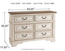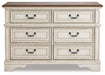 Elevating the art of traditional cottage styling, this dresser is your dream bedroom retreat realized. Its antiqued two-tone aesthetic blends a chipped white with a distressed wood finished top for added charm. Framed drawer fronts and decorative corbels add refinement, while bail pulls in a dark bronze-tone finish lend a classic touch.