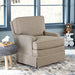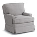 Transitionally styled this swivel glider chair features a banded, blown cushioning back and reversible, banded seat cushion. Clean, squared corners accentuate the arms and back which are highlighted with cording. Additionally the fabric can be customized in any of the 700 cover options! The look is finished off with a tall dressmaker skirt. A matching glide ottoman is also available.