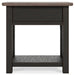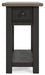 Quality crafted and richly styled, this rectangular chairside end table is sure to charm. Its two-tone aesthetic pairs a weathered grayish brown tabletop with a textured wire brushed base in black. A built-in shelf offers handy display space. And the table's integrated 110V power supply and dual USB charging ports make it so easy to keep your personal devices powered up.